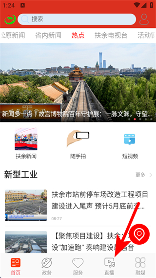 1、打開大美扶余首頁,點擊底部直播,進入直播功能板塊頁面。