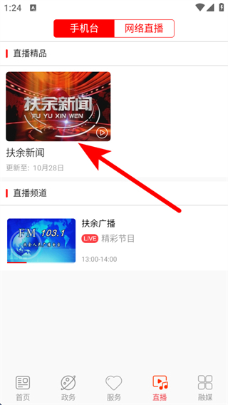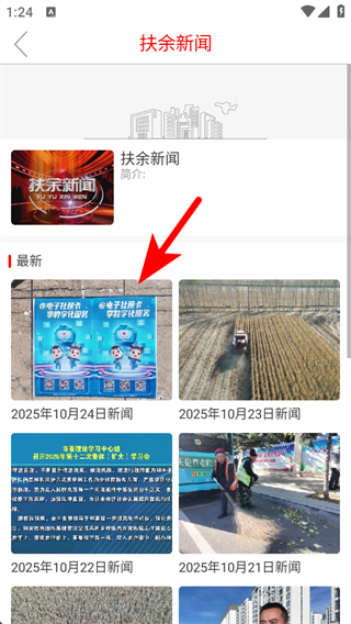 2、在直播板塊頁面,點擊扶余新聞,進入新聞視頻列表展示頁面。