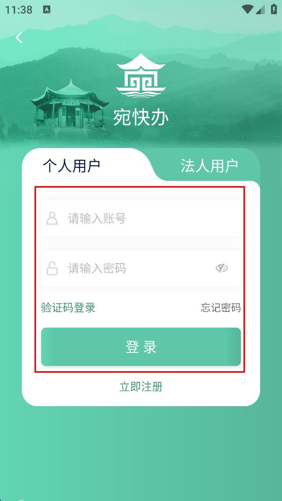 4、在宛快辦登錄頁面,選擇“個人用戶”,先在“請輸入賬號”框內(nèi)輸入賬號,再在“請輸入密碼”框內(nèi)輸入對應(yīng)的密碼,最后點(diǎn)擊“登錄”,即可完成城市通的登錄。