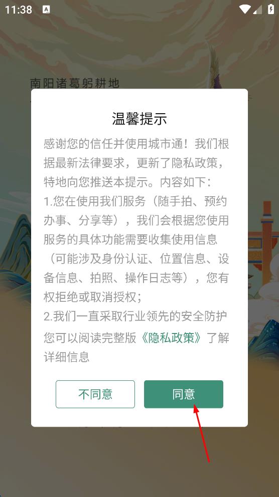 1、打開城市通,在彈出的溫馨提示框中,點(diǎn)擊“同意”,進(jìn)入城市通主界面。