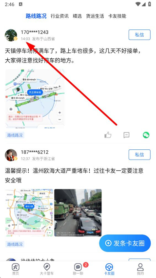 1、在車旺大卡app卡友圈頁面點擊要加為卡友的用戶發(fā)布的動態(tài),進入動態(tài)詳情頁面。