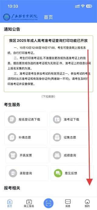 1、打開廣西成考app,進(jìn)入首頁下滑找到報(bào)考相關(guān)板塊。