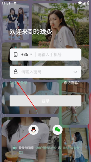 1、打開玲瓏灸APP,在登錄頁面點擊驗證碼登錄選項,勾選用戶服務(wù)協(xié)議。