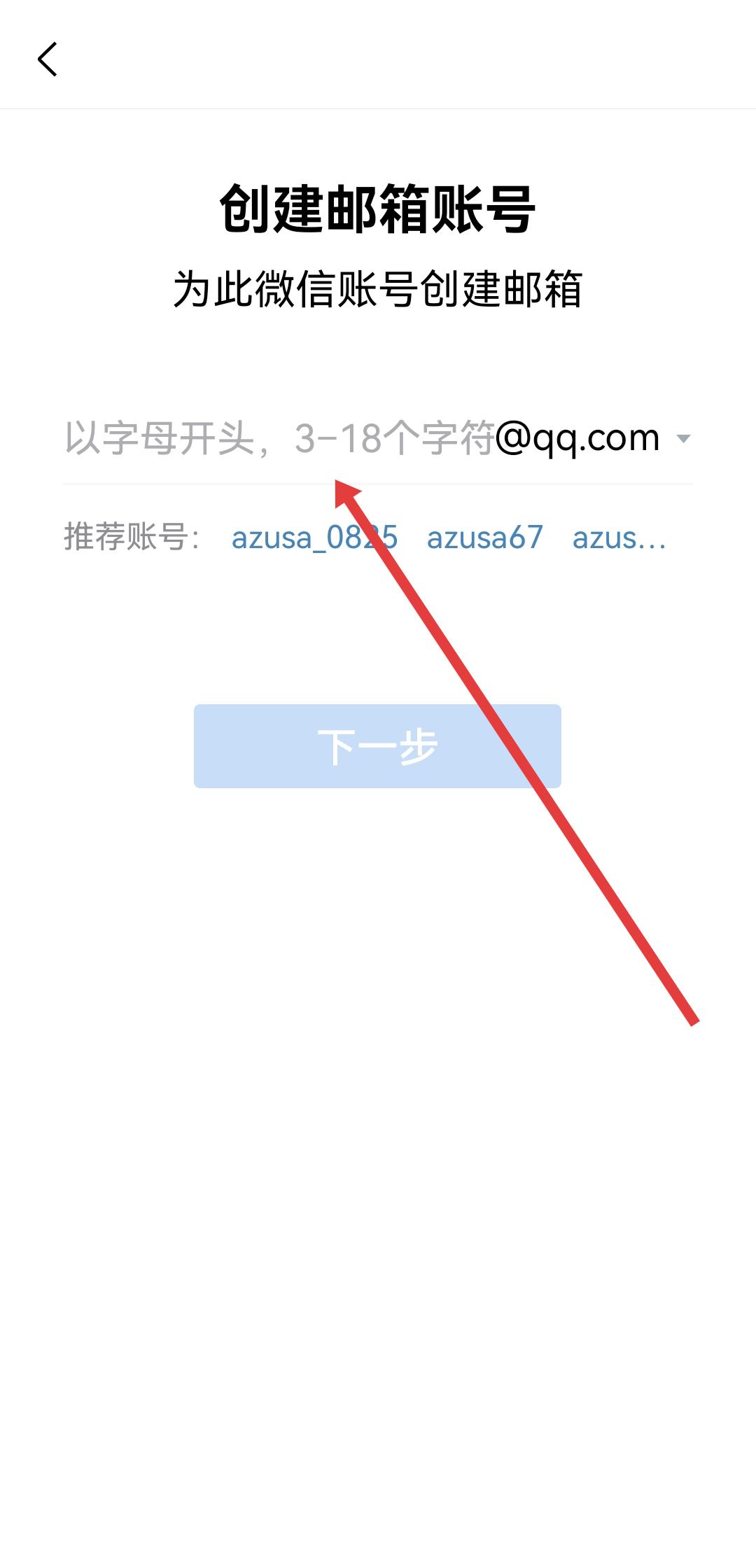 2、在創(chuàng)建郵箱賬號頁面,輸入以字母開頭,3-18個字符@qq.com格式的郵箱賬號,可參考推薦賬號,輸入完成后點擊下一步。