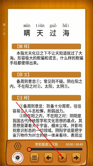 聽(tīng)故事學(xué)三十六計(jì)軟件手機(jī)最新版是非常好用的文學(xué)知識(shí)學(xué)習(xí)app,提供三十六計(jì)的有聲故事全集,支持播放、暫停、快進(jìn)、慢放等功能,用戶可通過(guò)拖動(dòng)進(jìn)度條調(diào)整收聽(tīng)進(jìn)度,每個(gè)計(jì)策都有詳細(xì)的原文、解釋和注釋版塊,用戶在聽(tīng)故事的同時(shí)可以閱讀相關(guān)文字內(nèi)容,深入理解三十六計(jì)的內(nèi)涵。