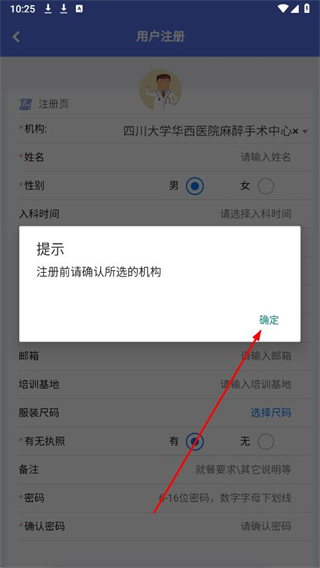 3、填寫注冊信息,選擇服裝尺碼,設(shè)置密碼并確認(rèn)密碼,點擊注冊,完成醫(yī)師注冊流程。
