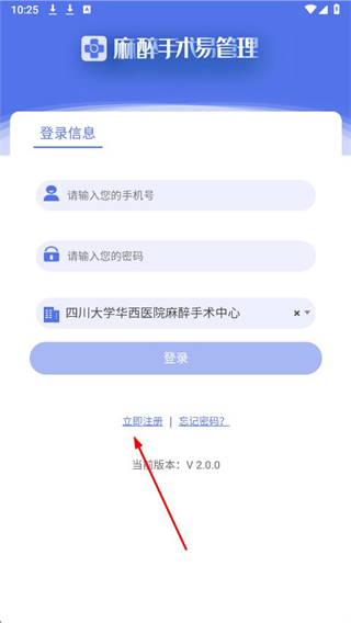 1、打開麻醉手術(shù)易管理APP,在登錄頁面點擊立即注冊。