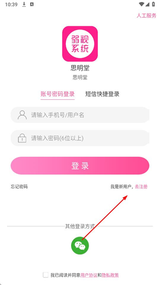 1、打開弱視訓(xùn)練系統(tǒng)APP,在登錄頁面點(diǎn)擊我是新用戶,去注冊(cè)。
