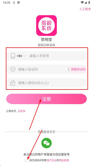 2、輸入手機(jī)號(hào)、填入驗(yàn)證碼、設(shè)置密碼,勾選用戶協(xié)議和隱私政策,點(diǎn)擊注冊(cè)。
