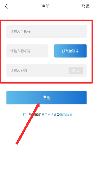 4、勾選登錄即同意用戶協議及隱私政策后,點擊注冊按鈕,完成注冊操作。