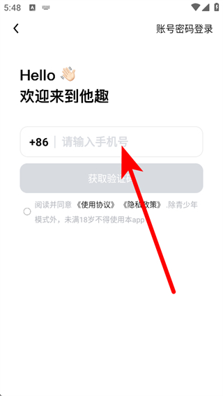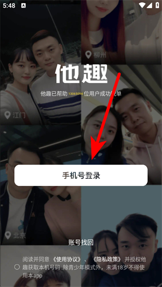1.打開他趣APP,點擊手機號登錄按鈕。