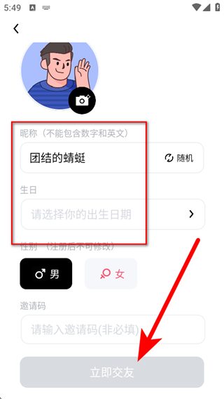 4.若為新用戶,需設(shè)置昵稱、生日、性別,點擊立即交友即可完成登錄并注冊。