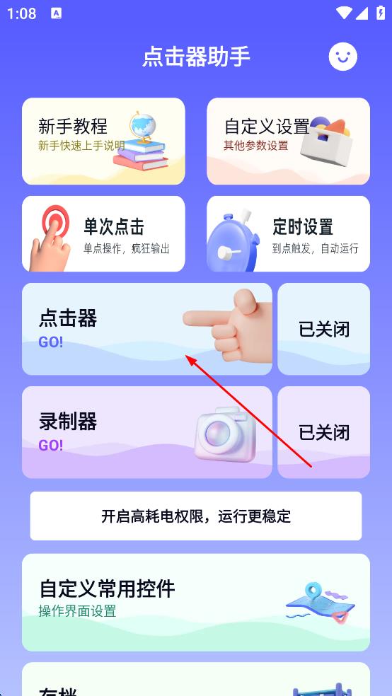 1、打開點(diǎn)擊器助手APP,點(diǎn)擊點(diǎn)擊器GO按鈕。