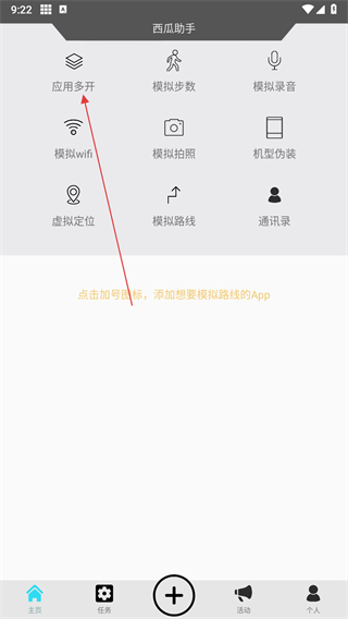 1、打開(kāi)西瓜助手應(yīng)用,找到并點(diǎn)擊應(yīng)用多開(kāi)選項(xiàng),進(jìn)入應(yīng)用多開(kāi)功能板塊。