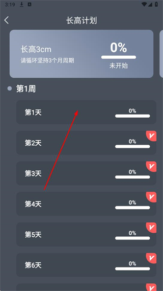 2、進(jìn)入長(zhǎng)高計(jì)劃頁面,點(diǎn)擊第1天的訓(xùn)練安排。