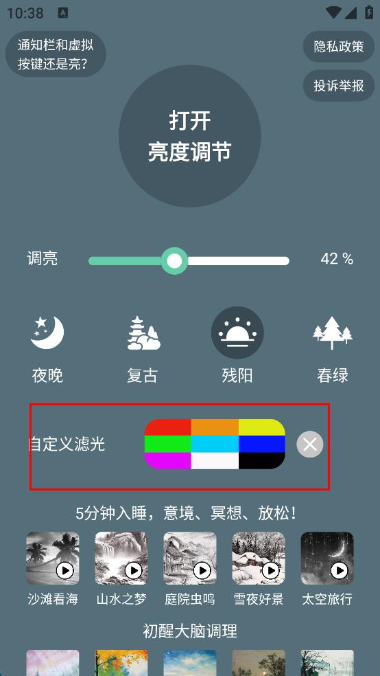 4、在“自定義濾光”區(qū)域,可選擇不同顏色方塊,設(shè)置自定義濾光效果。