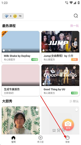 1、打開有心跳舞蹈app,點擊底部導(dǎo)航欄的宿舍選項。