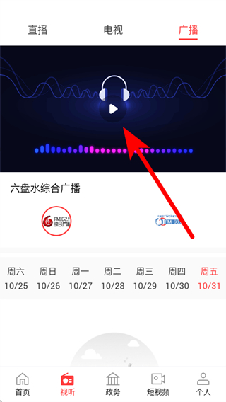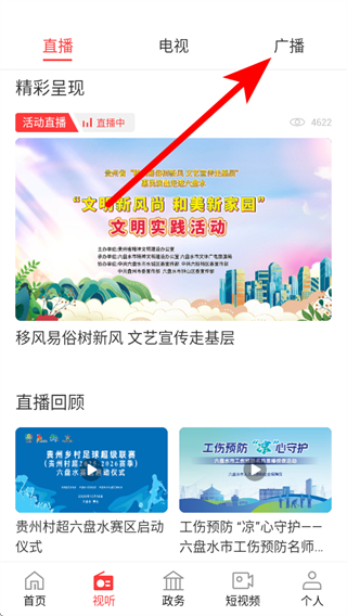 2、在視聽(tīng)頁(yè)面中,點(diǎn)擊頂部的廣播標(biāo)簽,切換到廣播界面。