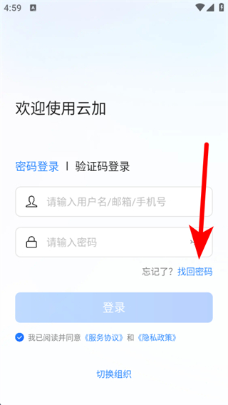 1、打開云加APP登錄的頁面,需要點(diǎn)擊忘記了找回密碼。