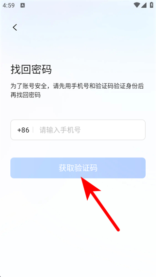 2、進(jìn)入找回密碼頁面,輸入手機(jī)號(hào)后點(diǎn)擊獲取驗(yàn)證碼。
