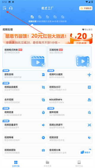 1、啟動(dòng)格式工廠的APP,點(diǎn)擊首頁(yè)左上角設(shè)置的圖標(biāo)。