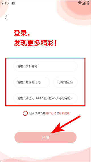 4、依次輸入手機(jī)號碼等信息,勾選政策后,點擊注冊完成操作。