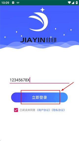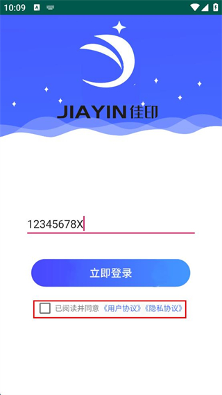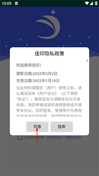1、打開佳印APP,在隱私政策彈窗中點擊“同意”按鈕。