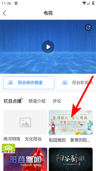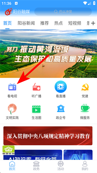 1、打開陽谷融媒APP首頁,點(diǎn)擊看電視按鈕,進(jìn)入電視的板塊。