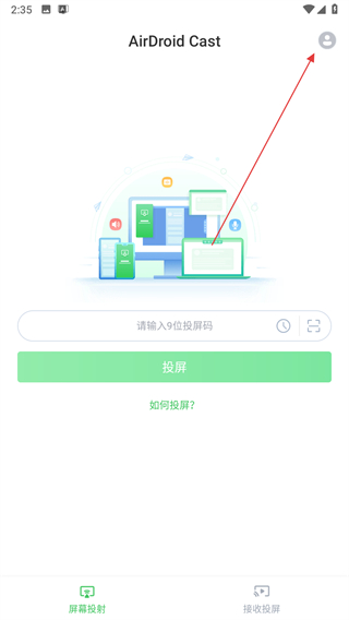 1、打開AirDroid Cast應用,點擊右上角的人形圖標。