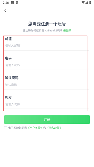 4、依次輸入郵箱、密碼、確認密碼、昵稱,然后點擊注冊按鈕。