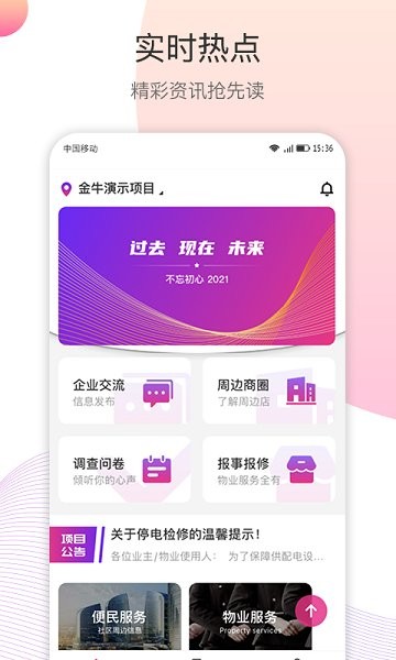 用于成都金牛一號港項目,園區(qū)運營使用??梢詫崿F(xiàn)報事報修、車輛通行繳費、企業(yè)服務(wù)、物業(yè)費等相關(guān)費用繳費、發(fā)票查詢與申請等功能。提升園區(qū)入駐企業(yè)的服務(wù)感知。