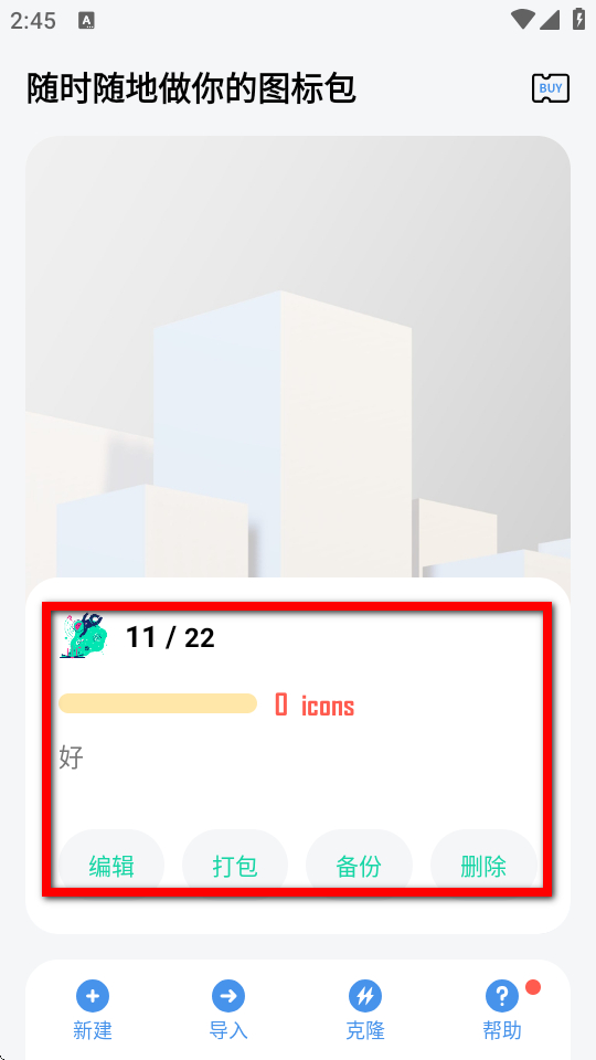 -- 本應(yīng)用以圖標(biāo)包為基本單位,首頁(yè)可點(diǎn)擊添加按鈕創(chuàng)建不同的圖標(biāo)包實(shí)例。對(duì)于每個(gè)實(shí)例,圖標(biāo)包的logo將會(huì)作為導(dǎo)出apk的logo,名稱將會(huì)作為導(dǎo)出apk的名稱,作者也將會(huì)體現(xiàn)在導(dǎo)出apk的信息頁(yè)面。