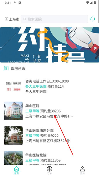 1、打開上海掛號預(yù)約APP,在首頁醫(yī)院列表中選擇要掛號的醫(yī)院。
