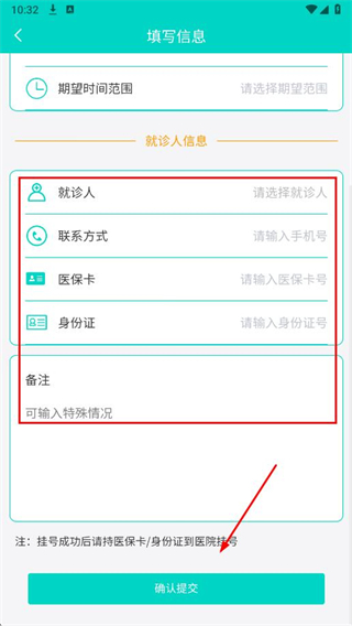 5、填寫就診人信息,可在備注欄輸入特殊情況,點(diǎn)擊確認(rèn)提交。