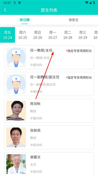 3、在醫(yī)生列表中選擇要掛號的醫(yī)生,例如任一教授或主任。