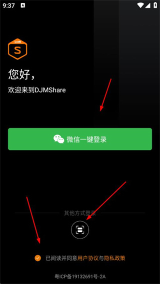 1、打開DJMShare APP,勾選協(xié)議,可選擇微信一鍵登錄,或者點(diǎn)擊其他方式登錄。