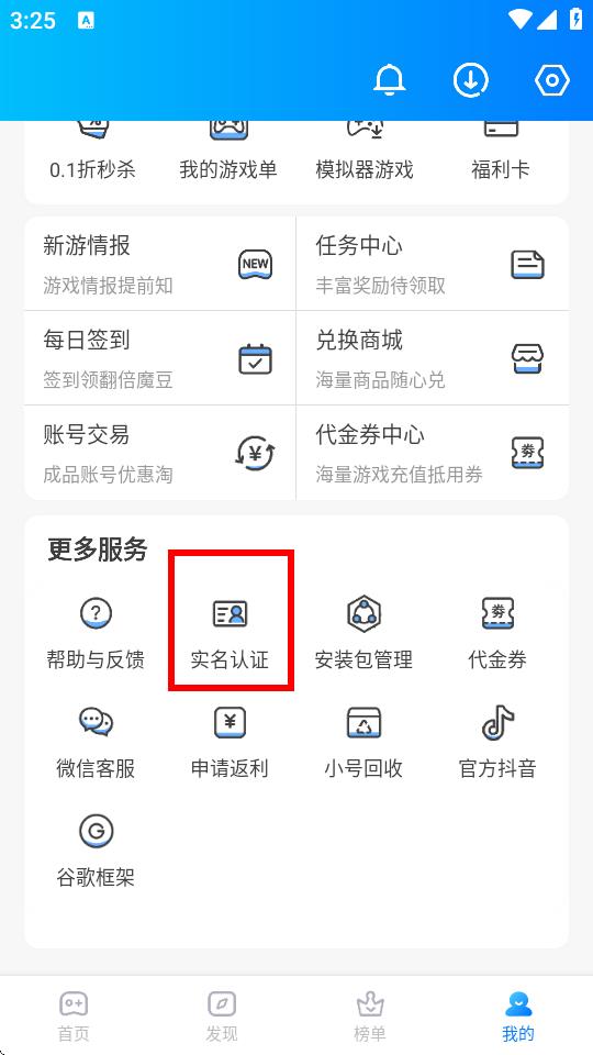 2、在個(gè)人頁面的更多服務(wù)板塊中,點(diǎn)擊實(shí)名認(rèn)證選項(xiàng)。
