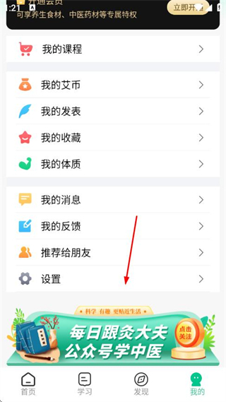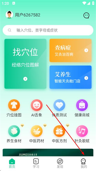 1、打開灸大夫app,進(jìn)入首頁,點(diǎn)擊底部導(dǎo)航欄中的我的選項(xiàng)。