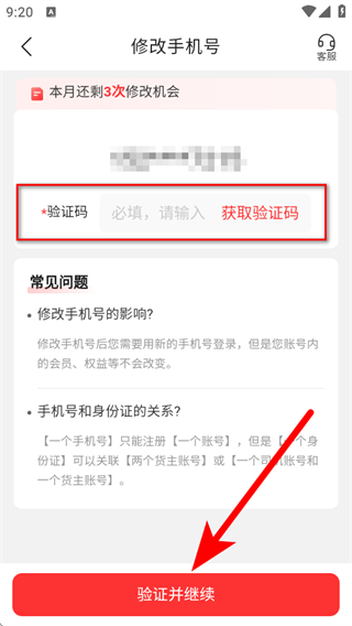 4、在修改手機(jī)號頁面,輸入驗(yàn)證碼后點(diǎn)擊驗(yàn)證并繼續(xù),按照提示完成操作。