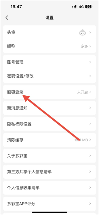 3、進(jìn)入設(shè)置頁面后,點(diǎn)擊面容登錄選項(xiàng)。