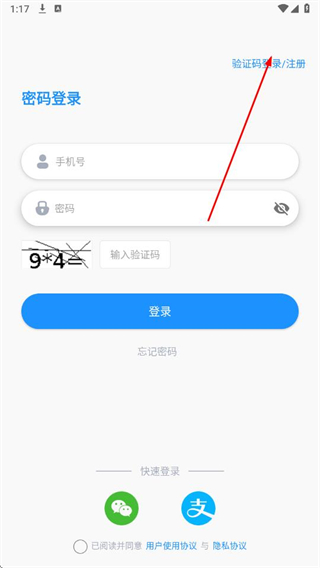 1、打開醫(yī)信APP,在登錄頁面點擊右上角的驗證碼登錄/注冊。