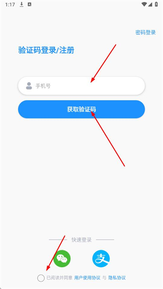 2、輸入手機號,勾選用戶使用協(xié)議與隱私協(xié)議,點擊獲取驗證碼。