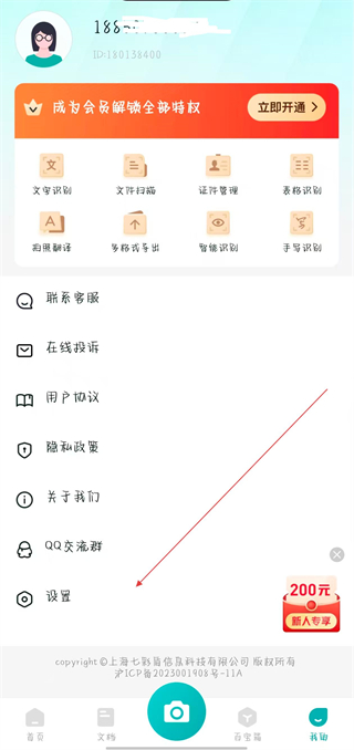 1、打開萬能文字識別應用,進入個人頁面,點擊我的頁面中的設(shè)置選項。