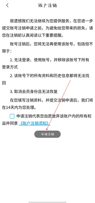 3、進入賬戶注銷頁面后,勾選賬戶注銷須知,然后點擊頁面下方的申請注銷按鈕。