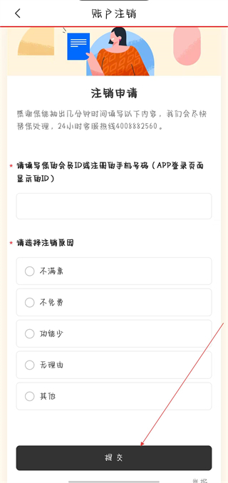 4、在注銷申請頁面,填寫會員ID或注冊的手機號碼,選擇注銷原因,最后點擊提交按鈕。