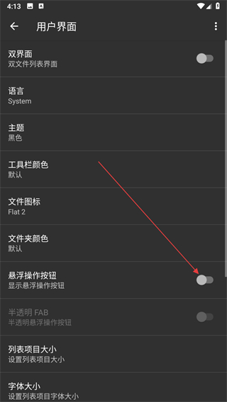 4、在用戶界面頁面,找到懸浮操作按鈕選項,點擊其開關(guān)。
