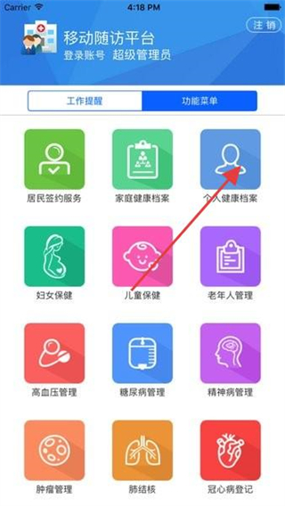 2、在功能菜單頁面點(diǎn)擊個(gè)人健康檔案選項(xiàng)。