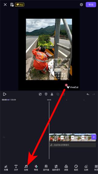 3、進(jìn)入視頻編輯界面后,點(diǎn)擊底部工具欄中的音頻選項(xiàng)。