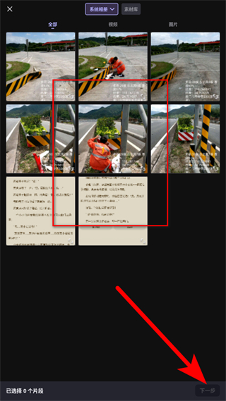 2、在系統(tǒng)相冊(cè)或素材庫(kù)中,選擇要編輯的圖片或視頻片段,選好后點(diǎn)擊下一步。
