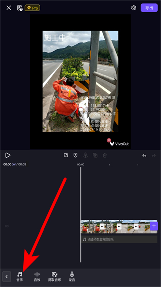 4、在彈出的音頻相關(guān)選項(xiàng)中,點(diǎn)擊音樂(lè),然后從音樂(lè)庫(kù)中挑選合適的音樂(lè)添加到視頻中。
